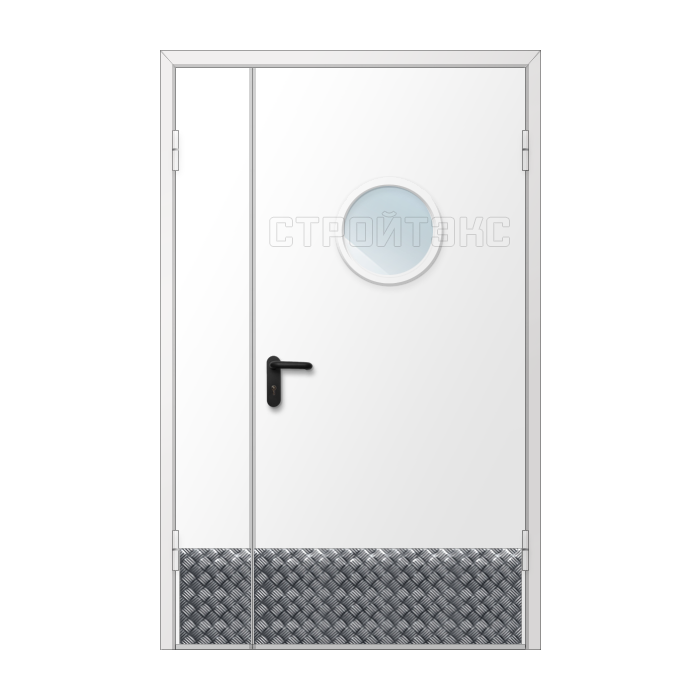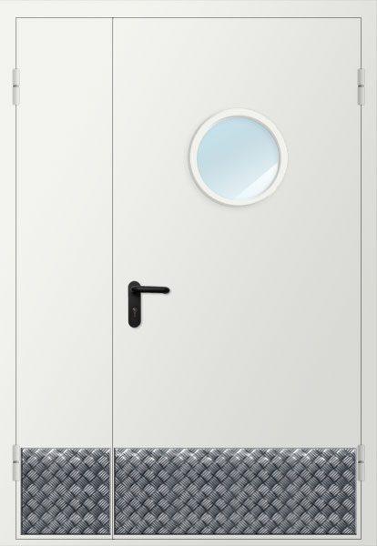Дверь двупольная металлическая противопожарная с остеклением изготавливается по индивидуальным размерам на нашем собственном производстве. Полотно и рама двери выполнена из металла 1,2 или 1,4 мм. Цвет двери может быть абсолютно любой по шкале RAL, используем порошковое напыление. Качественная упаковка обеспечит доставку в другой регион без рисков. Срок изготовления в среднем занимает 7 дней.